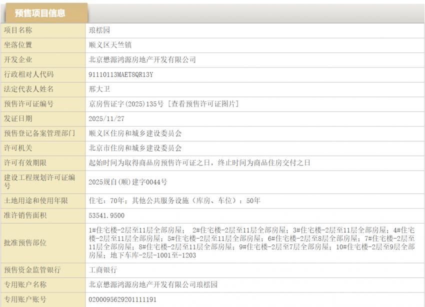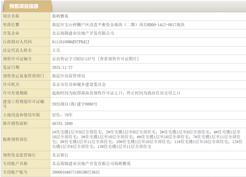 具体来看,北京隅海岄(东侧0017地块)(备案名:海岄雅苑)批准预售部位涉及12栋住宅楼(1-8#、10-13#),准许销售面积56783.38平方米,共计442套房源,预售住宅拟售均价在9万元/㎡-9.7万元/㎡之间。该项目由金隅集团开发,整体规划13栋6-11层纯洋房,容积率2.1,主推建面约108-145㎡三至四居改善户型,社区内配备了约1800㎡的下沉式无界会所,今日(11月28日)正式开盘。