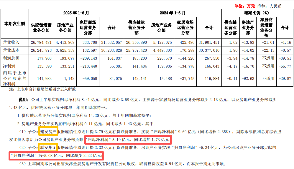 这份差距在业绩上看非常直观。根据建发股份2025年半年报,它的房地产业务整体归母净利润只有0.11亿元。其中,建发房产贡献了5.19亿元的正利润,而联发集团却亏了5.08亿元。一正一负,云泥之别。