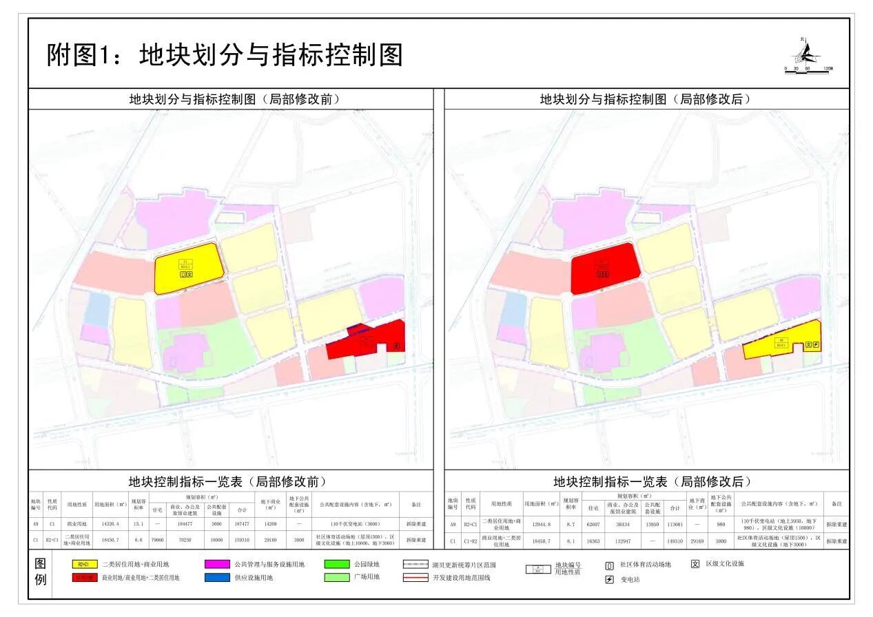 1.A9地块:用地性质由商业用地(C1)调整至二类居住用地 商业用地(R2 C1),用地面积由14320.4平方米调整至12944.8平方米,规划容积率由13.1调整至8.7。地上总建筑面积由187477平方米调整至113081平方米,其中商业、办公及旅馆业建筑由184477平方米调整至36434平方米,住宅由0调整至62697平方米,公共配套设施由3000平方米调整至13950平方米。地下商业建筑面积由14269平方米调整至0。地下公共配套设施由0调整至980平方米。公共配套设施内容由“110千伏变电站(3000平方米)”调整为“110千伏变电站(地上3950平方米、地下980平方米)、区级文化设施(10000平方米)”。