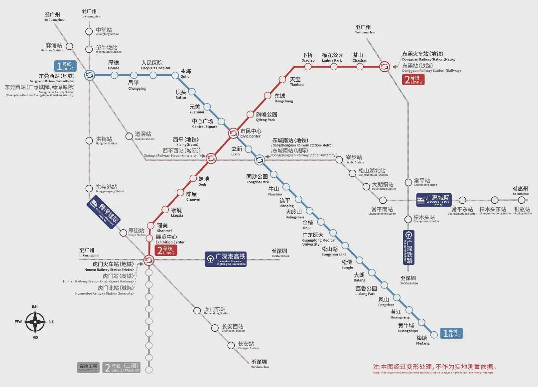 东莞地铁1号线的开通不仅完善了市内交通网络,更强化了跨城通勤效能。在市内,市民中心站可站内换乘东莞地铁2号线,快速通达虎门高铁站等关键节点;在跨城层面,东莞西站可换乘广惠城际、穗深城际。