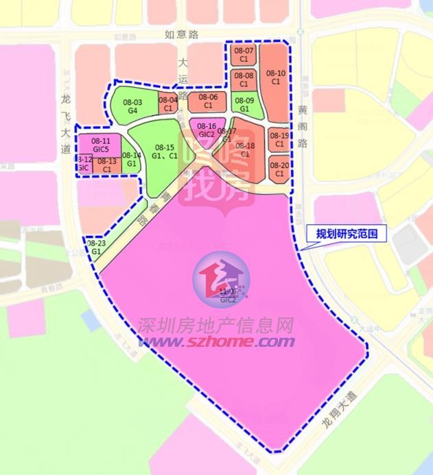 本次研究范围包括深港国际中心12宗流拍地块以及大运中心场馆地块,位于龙岗区龙城街道,黄阁路以西,龙飞大道以东,如意路以南,龙翔大道以北,涉及[大运枢纽站及周边地区]法定图则08-03、08-04、08-06、08-07、08-08、08-09、08-10、08-11、08-12、08-13、08-14、08-15、08-16、08-17、08-18、08-19、08-20、08-23及11-01共19个地块,面积约为81.2公顷。