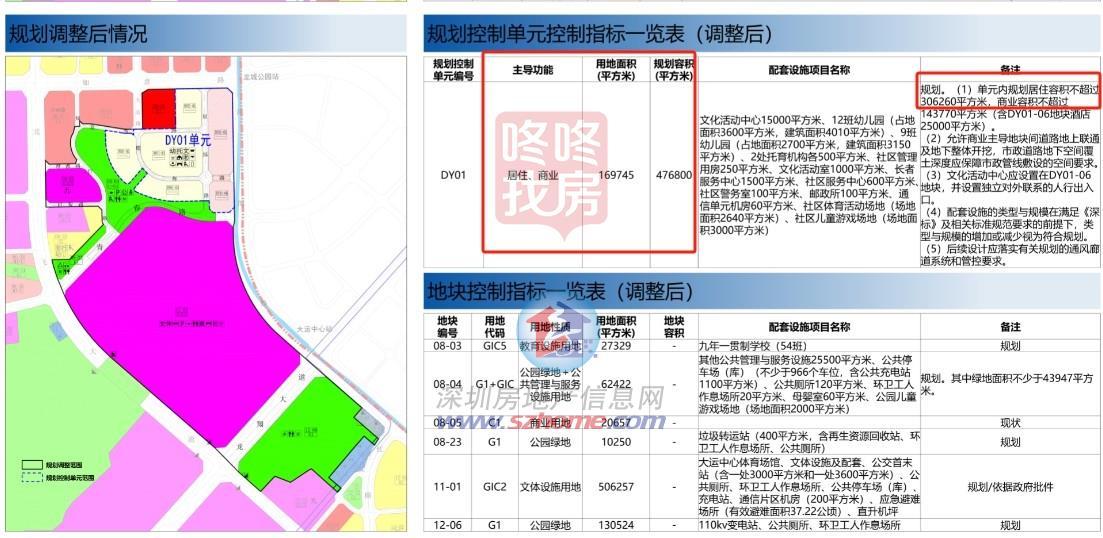 本次拟对[大运枢纽站及其周边地区]法定图则08-03、08-04等地块进行规划调整。该DY01规划控制单元地块调整后主导功能为居住、商业,用地面积169745平方米,规划容积476800平方米。该单元内规划居住容积不超过306260平方米,商业容积不超过143770平方米;