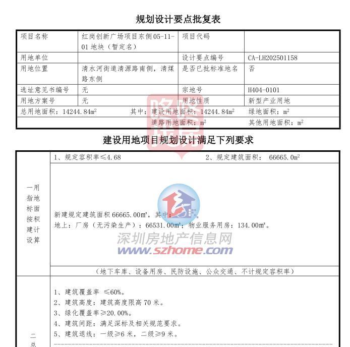规划显示,本宗地规定建筑面积66665平方米,包括:厂房(无污染生产)66531平方米、物业服务用房134平方米。