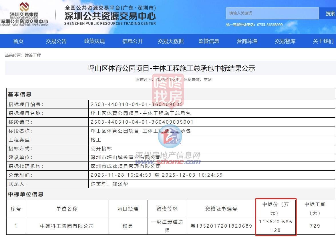近日,深圳市坪山城投置业有限公司发布坪山区体育公园项目-主体工程施工总承包中标结果公示。