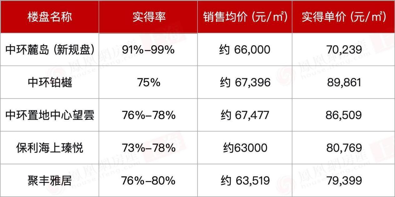 中环麓岛实得单价约为7.02万元/㎡;而周边旧规项目中,中环铂樾约为8.99万元/㎡,中环置地中心望雲约为8.65万元/㎡,聚丰雅居约为7.94万元/㎡,保利海上瑧悦约为8.08万元/㎡。