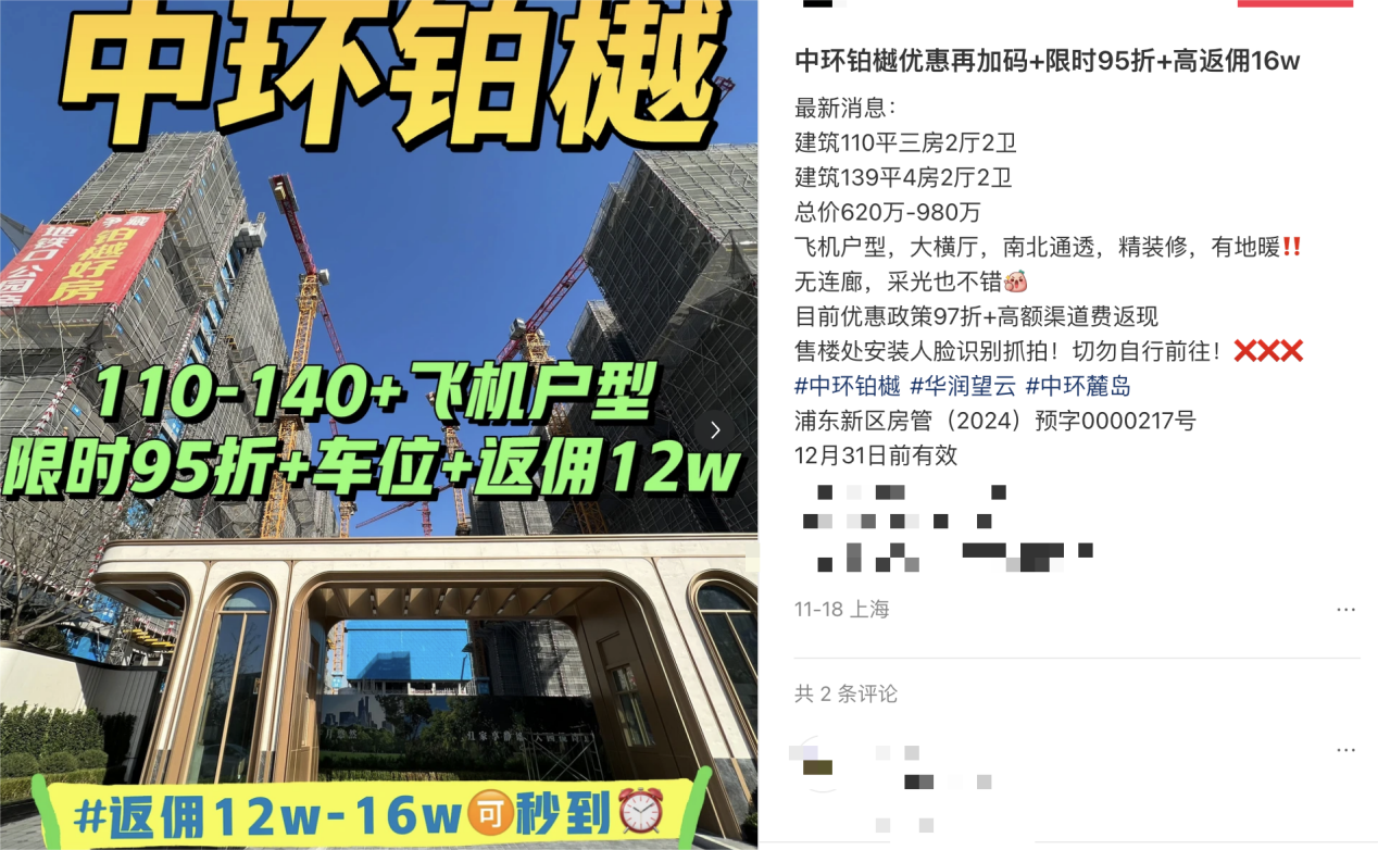 中环铂樾,今年6月开盘时,项目只给了5.88万车位券的小甜头;10月份勉强松口,给到98折,但买车位还得额外掏6万;到了现在,直接甩出“95折+送车位+12万-16万返佣”的组合拳,优惠力度肉眼可见地加码,完全是豁出去的架势。
