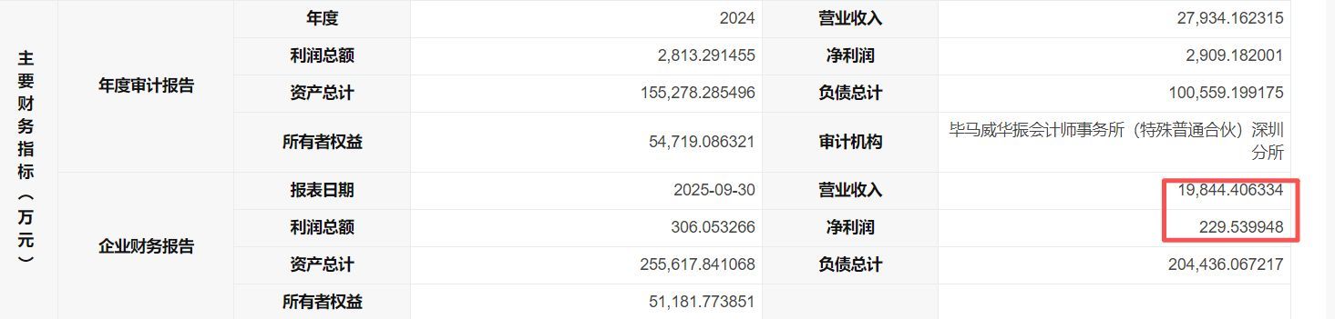 财务数据显示,2025年前三季度,该公司营收约1.98亿元,净利润约229.54万元;截至2025年9月底,资产总计约25.56亿元,负债总计约20.44亿元,净资产约5.12亿元。