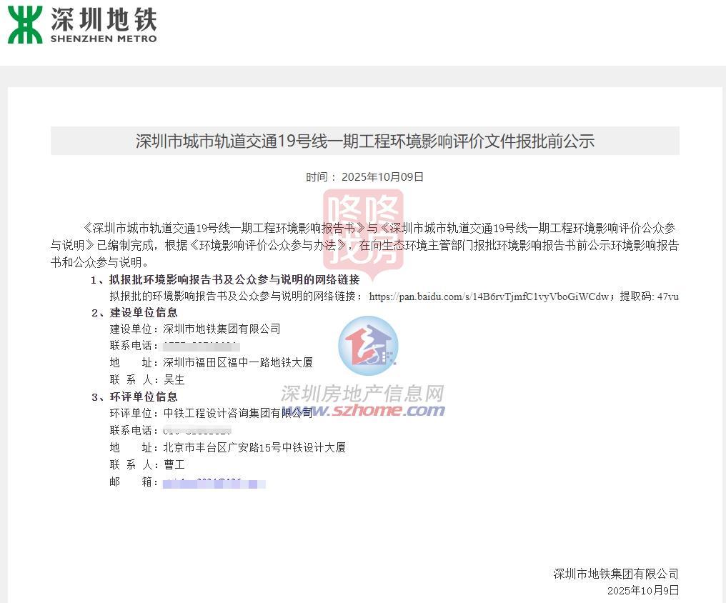10月9日,深圳地铁发布深圳市城市轨道交通19号线一期工程环境影响评价文件报批前公示。