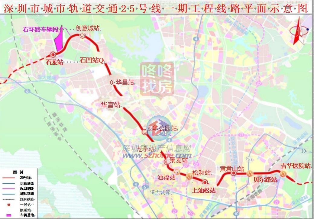 25号线一期工程位于深圳市龙岗区、龙华区及宝安区, 起自石龙站,终至吉华医院站。线路先后沿德政路、石龙仔路、大浪北路、华盛 路、龙华人民路、工业路、贝尔路、吉华路敷设,途经大浪、龙华中心、坂田等片区 。