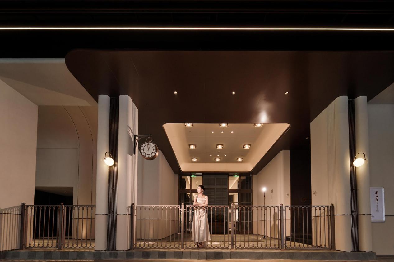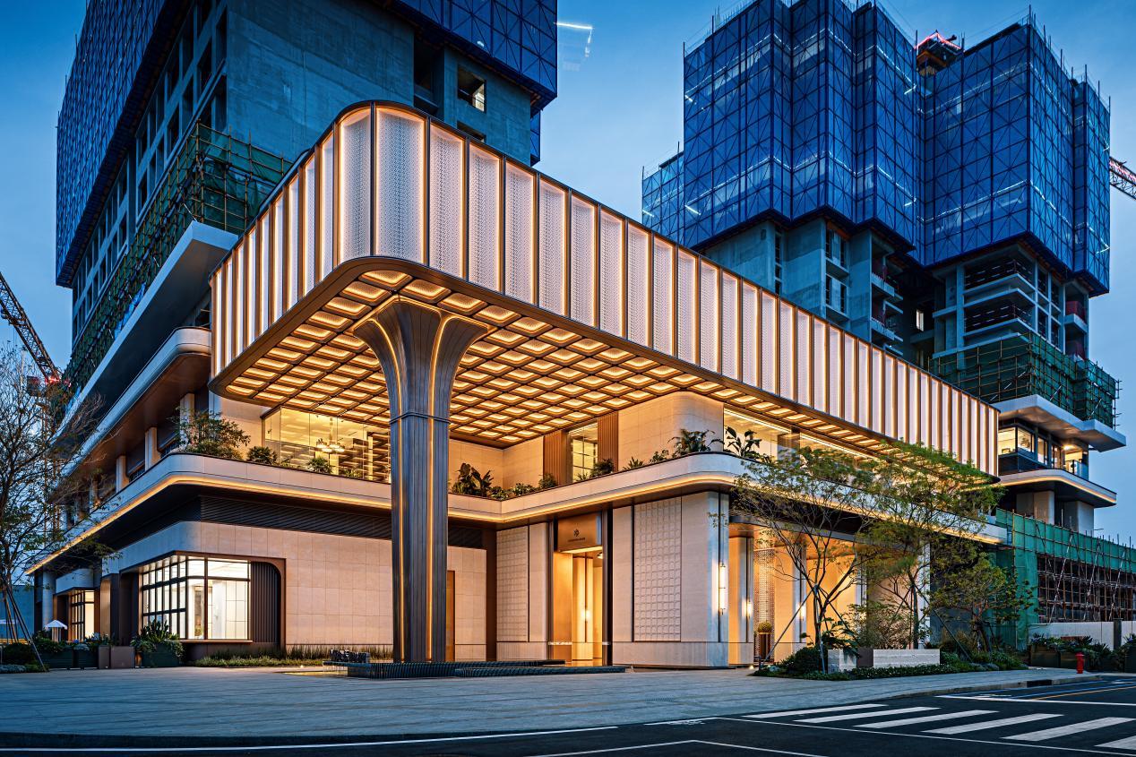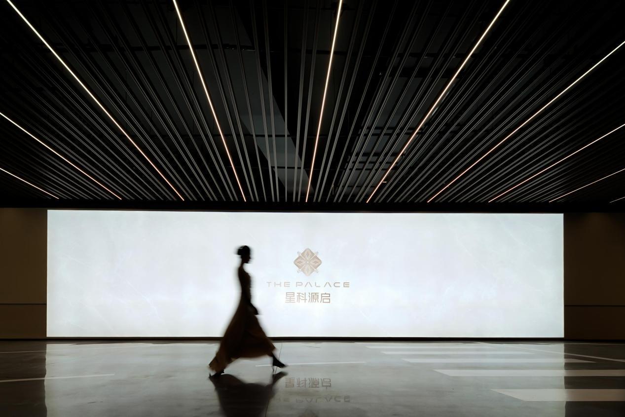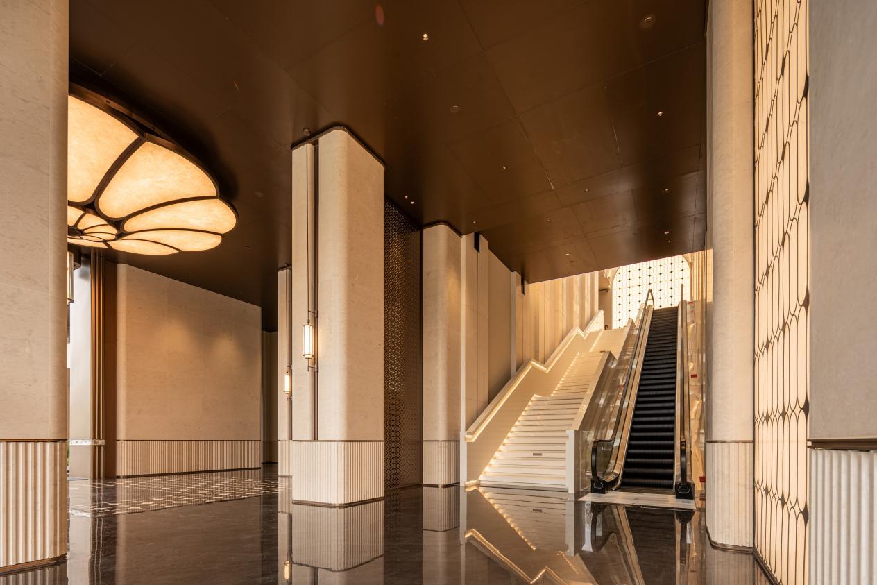 身处其中,“超配”二字可以说是如影随形:艺术感的花形树立柱以四叶花瓣造型在眼前徐徐展开,这里是卸下疲惫工作的第一站;步入建筑内部,天花上大型艺术发光装置每一片纹路都精心对接;随后沿着46阶步式台阶一路向前,仪式感铺满回家之路。
