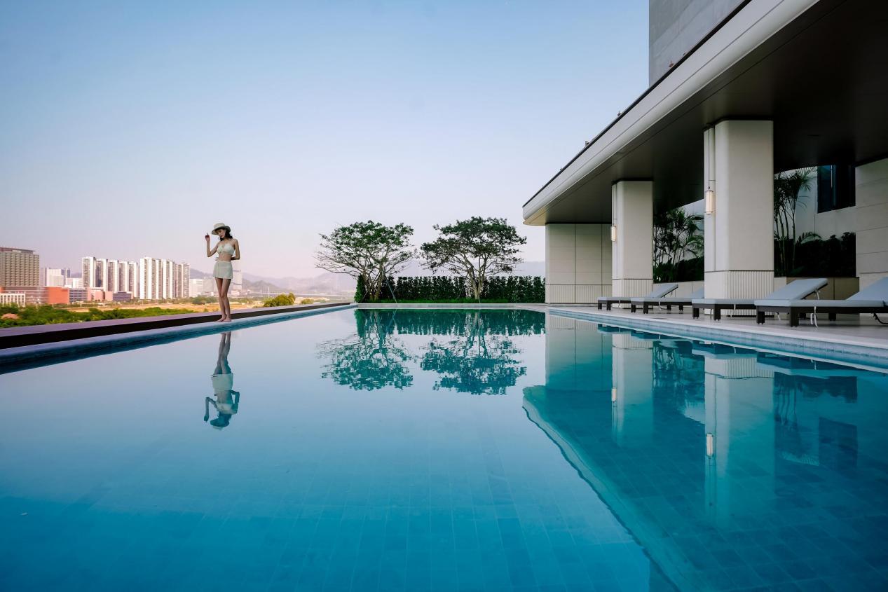 无边际泳池更是项目的点睛之笔。位于三楼的无边际泳池,以湄南河四季酒店为蓝本,成人池长约26米、宽约7.6米,搭配约1500px深儿童戏水池。池底铺贴东南亚顶奢酒店同款侘寂灰石材,注水后呈现天然浅蓝色泽,与科学公园的远山绿意形成视觉呼应。泳池西北侧直面科学公园“光明顶”,夜晚可俯瞰城市星光,营造“空中度假”氛围。