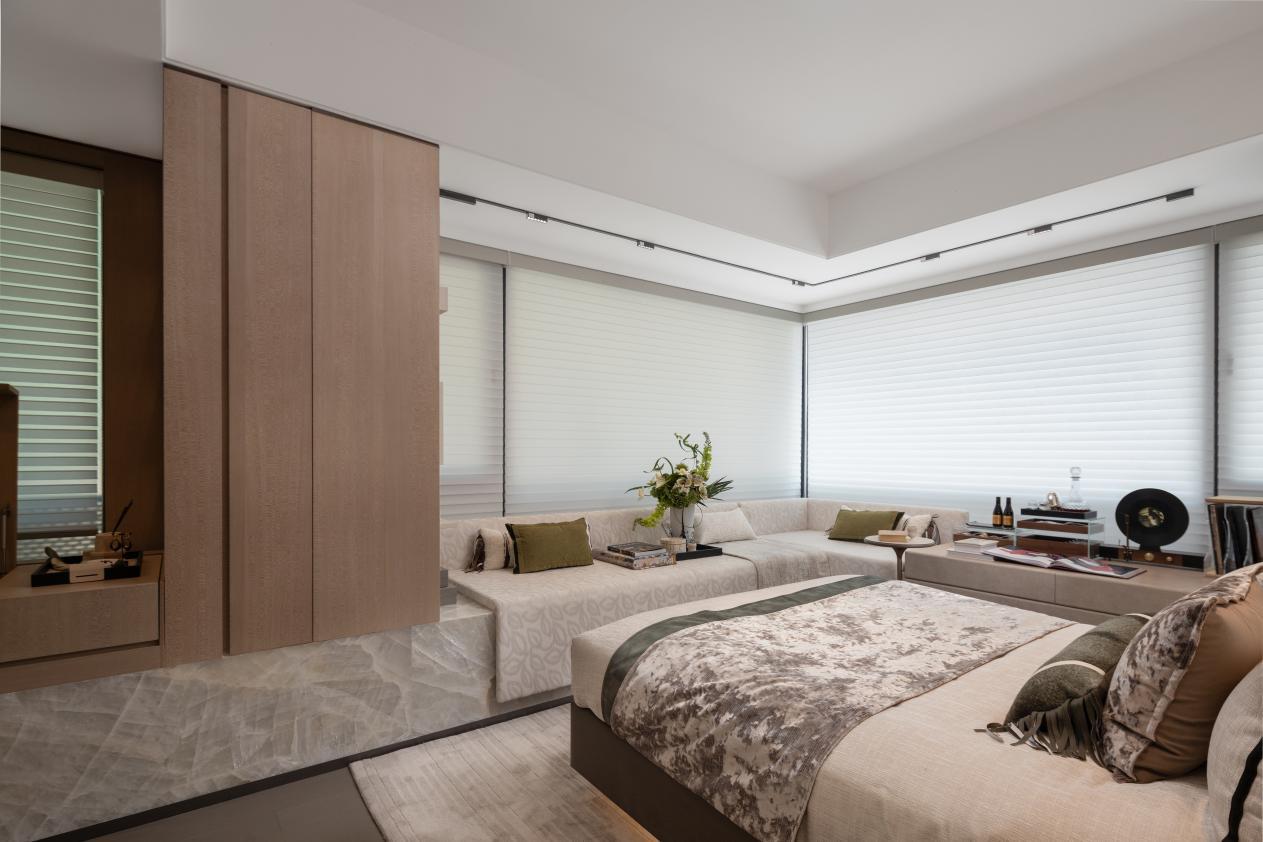 客厅通过拆除非承重墙,形成堪比140㎡大平层的大方厅格局,如此一来,LDKB客餐厅一体化设计使整个空间成为了一个“家庭互动场”,为家人间游戏、观影、学习提供了自如的场地。而主卧最惊艳的是长约8-9米的L型环幕飘窗,如同把IMAX影院搬进卧室,可打造成阅读角或梳妆区。