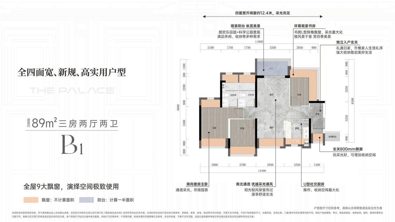 这是目前市面上稀有的89方拥有独立入户玄关且客餐厅和主卧南北双通透的户型。客餐厅与主卧实现南北双通透,且全屋九大飘窗赠送面积约17.45㎡;主卧套房则采用南北双飘窗,开间约3.6米,轻松容纳1.8米大床,完美契合当下城市购房者的全新需求,生活体验感因此而跃升。