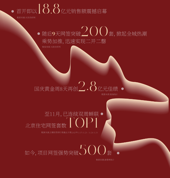 真正的热销,源于价值与需求的同频共振。朝棠揽阅自亮相起,便以实力领跑市场,首开即以18.6亿元销售额震撼启幕(数据来源:天朗房研网);随后9天网签突破200套,掀起全城热潮(数据来源:天朗房研网);乘势加推,迅速实现二开二罄;国庆黄金周8天再创2.8亿元佳绩(数据来源:于案场统计);至11月,已连续双周蝉联北京住宅网签套数TOP1。(数据来源:京楼销售排行榜截止日期:2025年11.17-11.23、11.24-11.30)如今,项目网签强势突破500套(数据来源:建委网统计),这一路攀升的轨迹,正是其强大产品力最硬的印证。我们悉心营造的八大生活场景,正是为时代菁英兑现这份理想的生活蓝图。