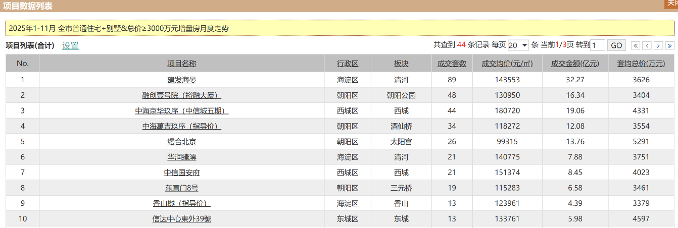 2025年1-11月 北京新房市场总价3000万及以上成交数据(来源:天朗房产)
