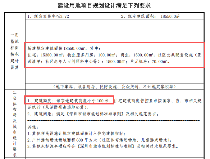 从规划设计指标来看,地块总建筑面积18550平方米,容积率≤3.72,建筑限高100米。其中住宅面积15380平方米,商业1500平方米,社区公共配套设施1500平方米(含老年人日间照料中心等),物业服务用房100平方米,单元机房70平方米。