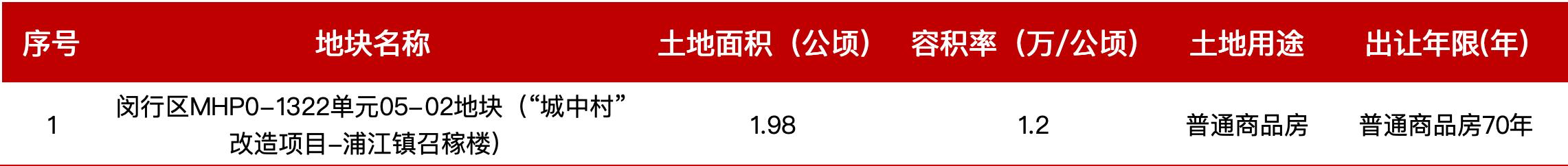 12月10日,上海市规划和自然资源局发布一则土地出让信息,闵行区MHP0-1322单元05-02地块(“城中村”改造项目-浦江镇召稼楼)拟以协议方式出让。