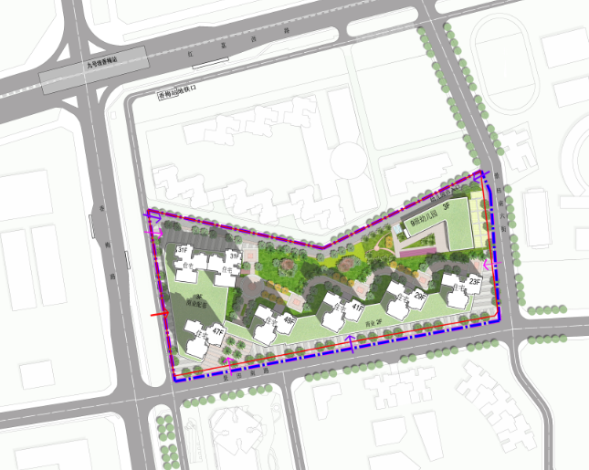 根据规划草案总平面布局示意图,该项目由7栋23-48层超高层住宅楼、1座9班幼儿园以及部分商业配套组成。