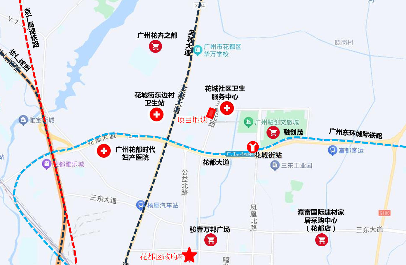 教育配套层面,周边有华南师范大学附属花都学校、罗仙小学、卢永 根纪念小学、长岗中学、黄广凤凰北小学、石岗小学等。此外,还有花都融创茂、花都迎宾广场等商业配套,以及广州市中西医结合医院、广州花都时代妇产医院等医疗配套。