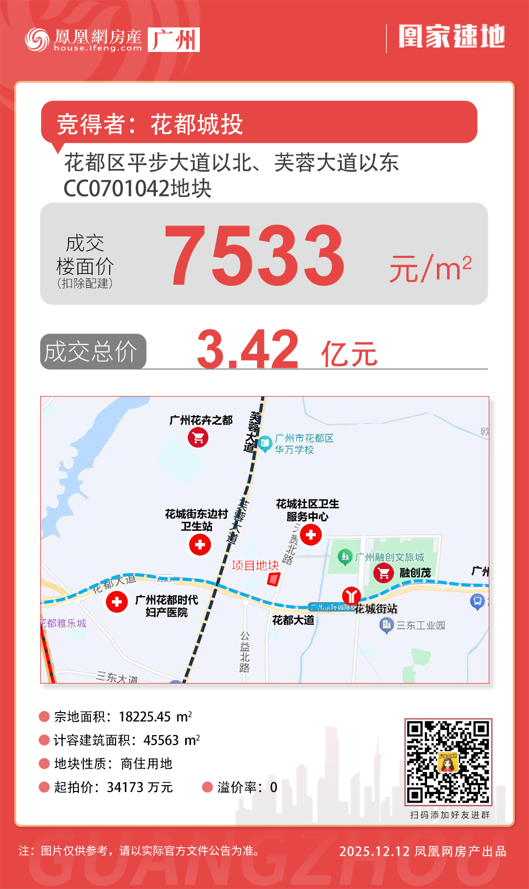 12月12日10时,花都区平步大道以北、芙蓉大道以东CC0701042地块进行限时竞拍,由广州花都城投西城经济开发有限公司,归属花都城投,以总价3.42亿元竞得,扣除配建后,折合楼面价为7533元/平。