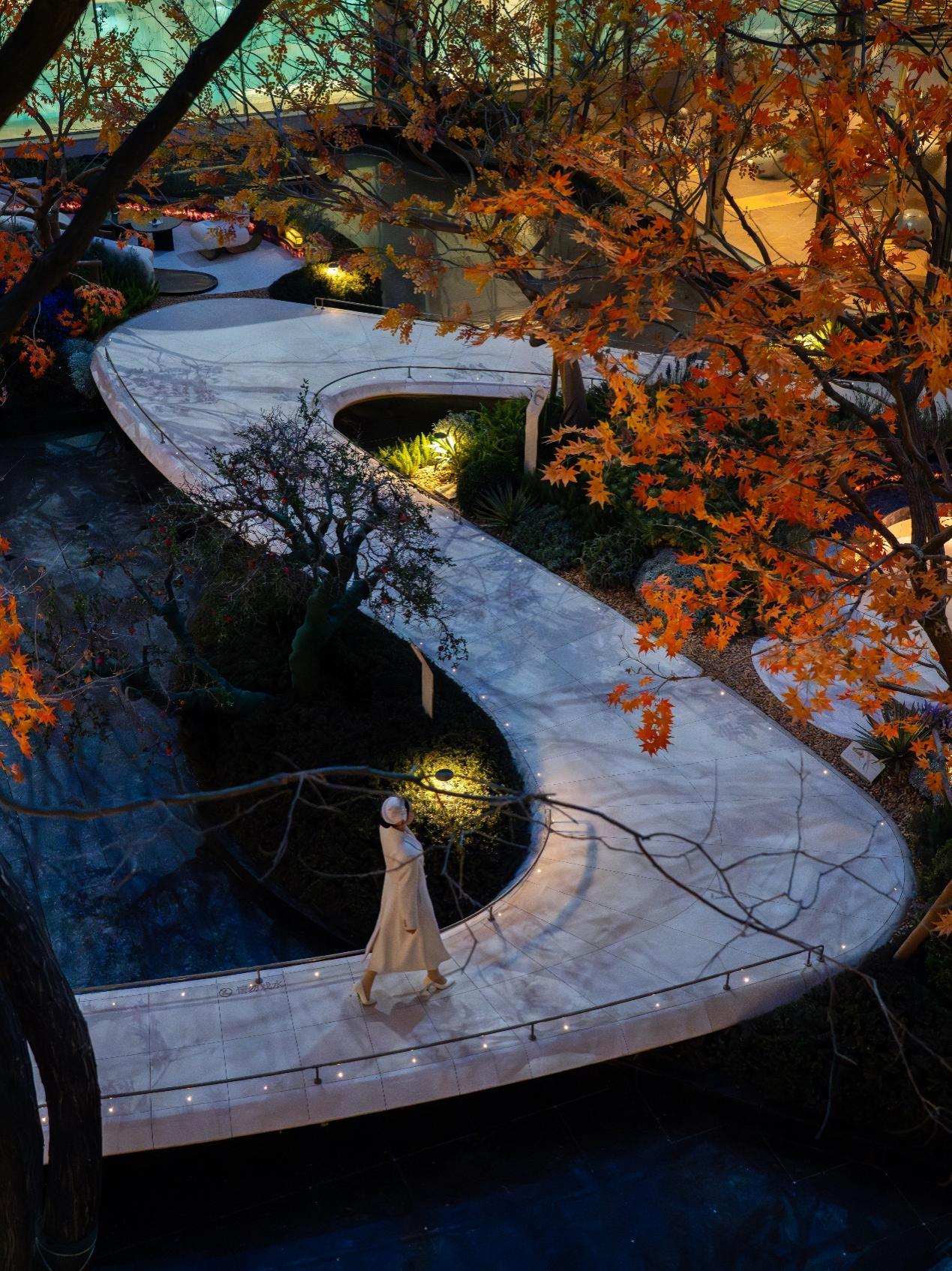 真正的奢华,在于可感知的松弛。在度假式庭院中,金茂满曜复刻了安缦酒店的松弛美学。沙生植物区内,龙舌兰、迷迭香与银叶菊搭配纯白砾石,营造出干燥而温暖的异域情调。一座悬浮平台置于水系中央,四周以珍贵的蓝金刚石材镶边,未来将与艺术会所入口对望,形成“浮台观景”的静谧画面。这里没有令人眼花缭乱的设计,只有自然材质与开阔视野带来的宁静与治愈。
