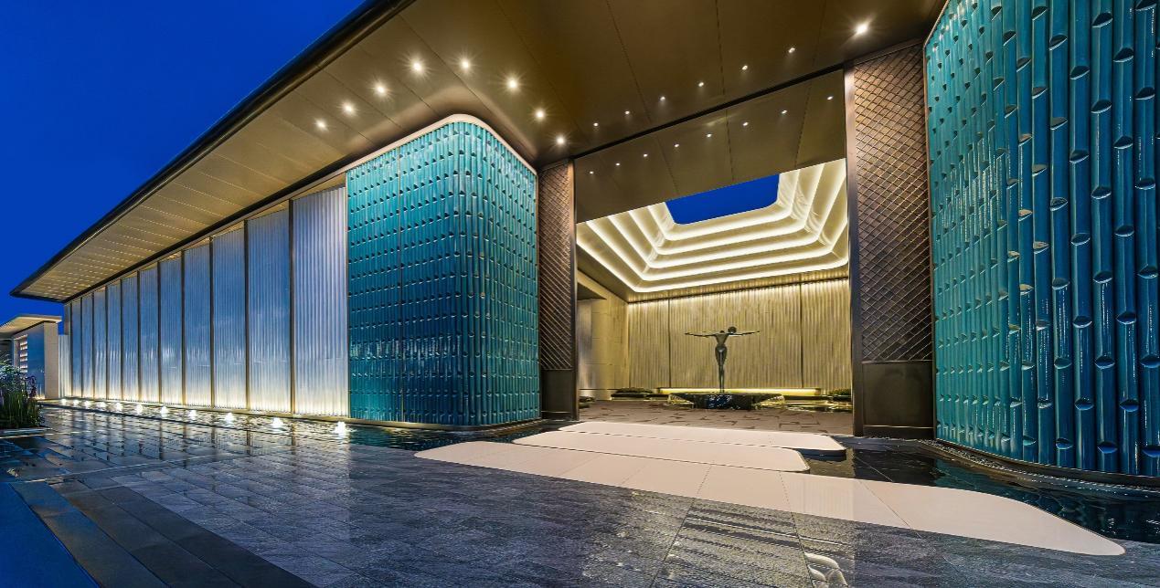 归家的仪式感,在65米横向跨度、穹顶达8.5米的震撼大门处达到高潮。定制蓝绿色陶板与汝窑白陶板构成的墙面,搭配重达2吨的纯铜大门,共同演绎出“隐奢”的入场式。这不仅是归家通道,更是心境转换的阈限,提醒着:从这里开始,步入另一种生活。