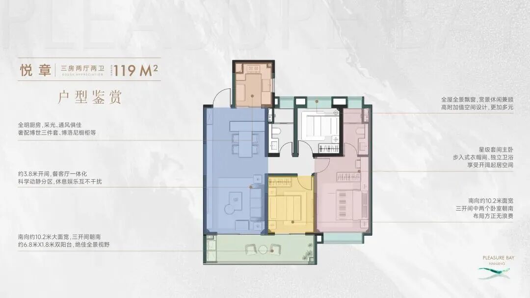 而且,建面约119㎡户型整体格局非常方正,三开间朝南 双阳台设计,南向超10米开间,阳台宽约6.8米,全屋多达4个飘窗,不仅实用性强,还带分户式科技系统,居住尊崇感满分!