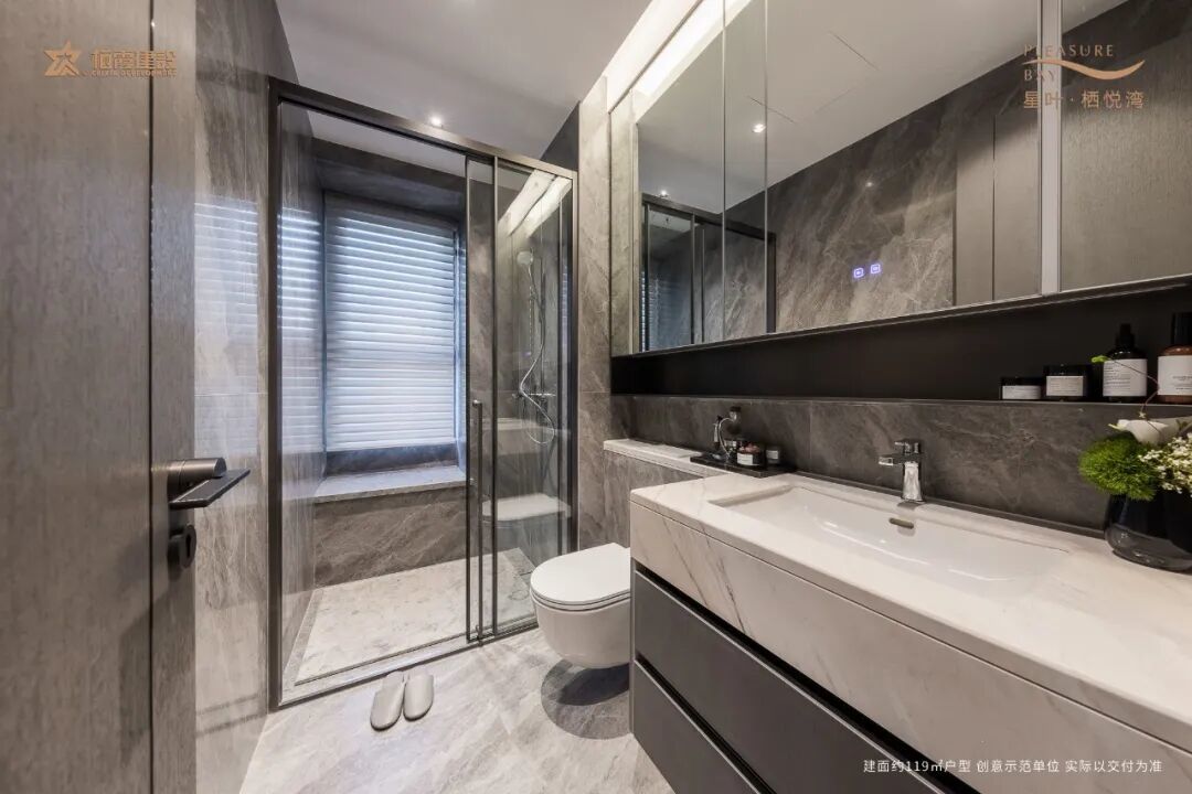 主卧卫生间基本都配置了劳芬双台盆、智能马桶,捷仕花洒、龙头,还有通铺到顶的镜柜,加热防雾,规格拉满。