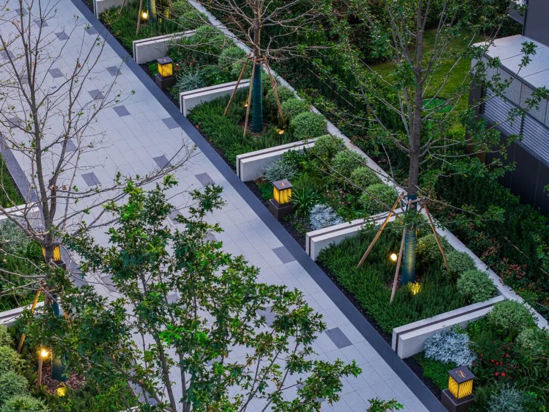 项目整体绿化率近37%,布局五进归家礼序、一道一轴,营造森系社区。漫步其中,榉树、龟甲冬青、红枫、迷迭香等各种树种植被高低错落,呈现出丰富的空间层次感。