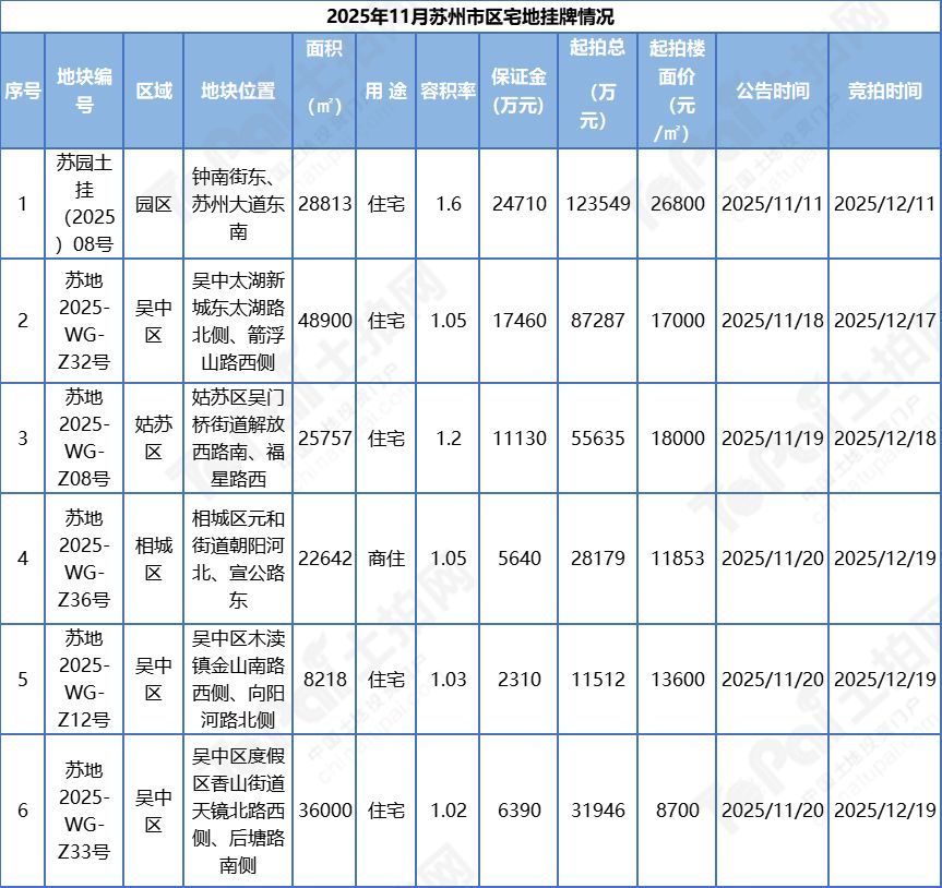以苏州为例,11月苏州市区挂牌的6宗宅地,供应占地面积17.03万平方米,起拍总价33.81亿元,容积率普遍较低,仅在1.02~1.6区间。