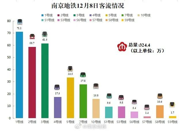 南京地铁12月8日客运量324.4,其中1号线71.1,2号线58.7,3号线61.5,4号线17.5,5号线33.5,7号线27.8,10号线15.8,S1号线9.6,S3号线9.8,S6号线5.4,S7号线1.4,S8号线10.6,S9号线1.7(以上单位: 万)
