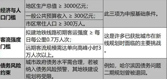目前来看地铁审批条件:主要包括GDP大于3000亿、财政收入大于300亿、常住人口大于300万、客流强度大于0.7万人次。