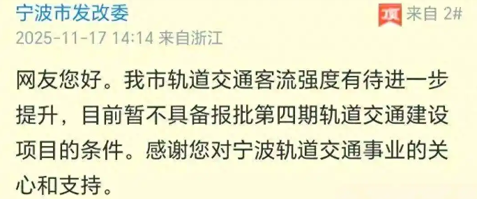 以宁波为例,据交通运输部发布的10月相关数据,宁波的客流强度仅为0.45万人次每公里日。宁波官方公开回复重提到,当地的轨道交通客流尚需增强,因此目前尚不具备启动第四期轨道交通建设项目的条件。