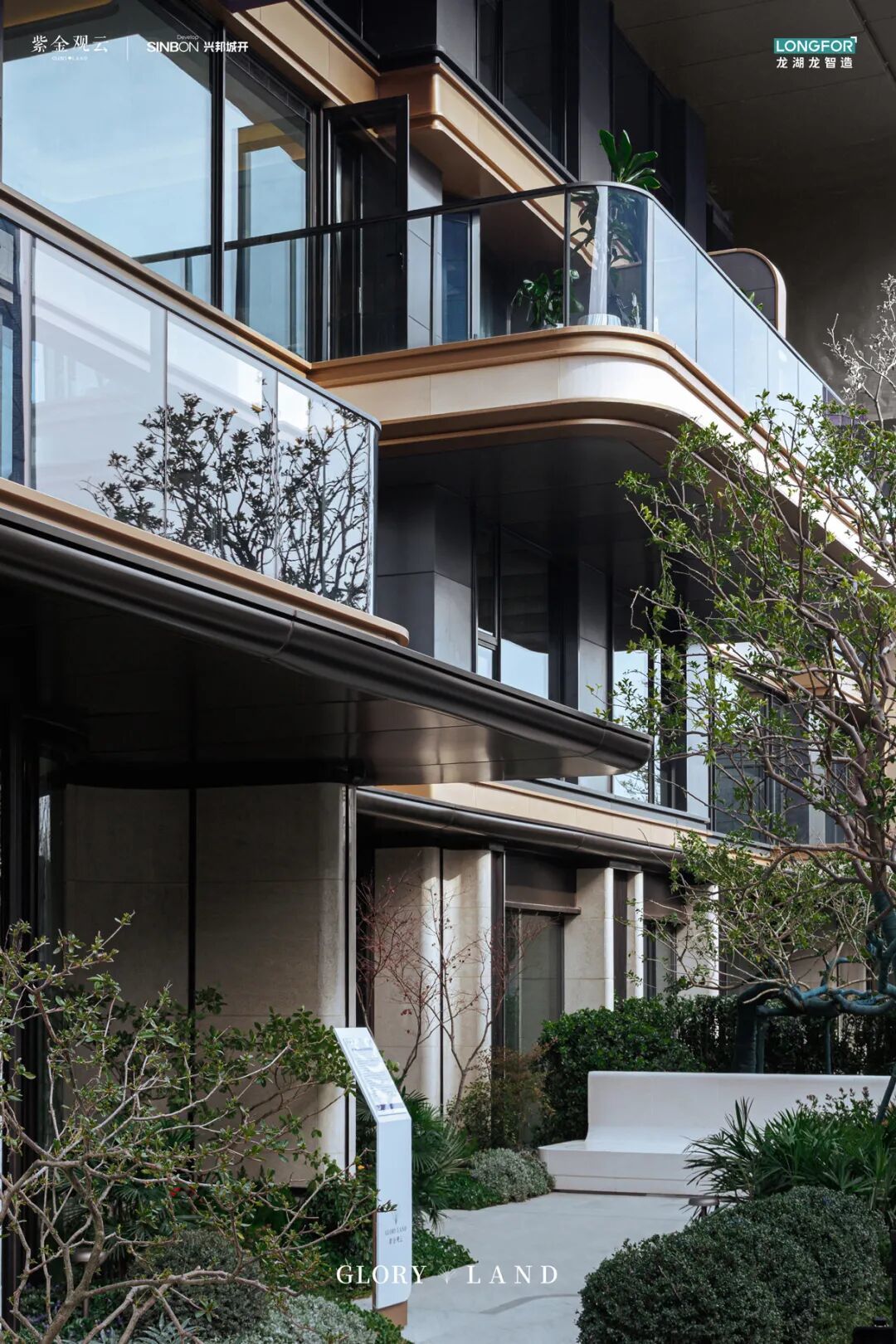大门处用贝金米黄石材为其底打造了80米的全石材超级城市界面,搭配深古铜铝板点缀,气势恢宏。