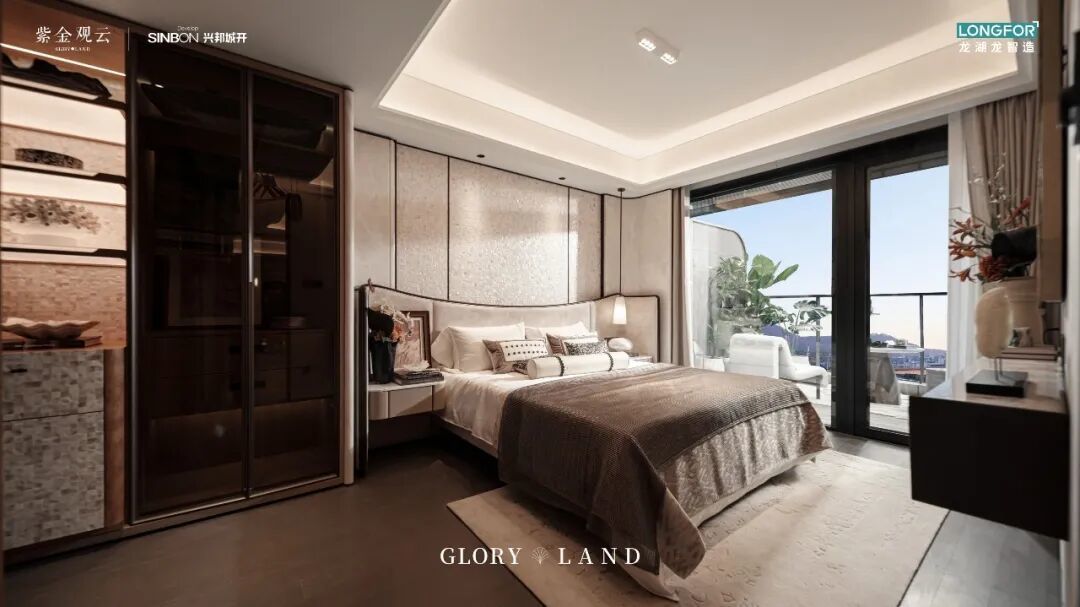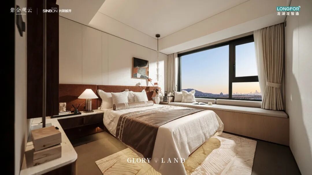 主卧套房连接约15㎡超大南向露台,270°无死角视野,直面紫金山自然风景。光、景与生活无缝衔接,室内外边界于此消融,生活场景与天地景致融为一体,为家装上巨幅“自然取景框”,情绪价值拉满。
