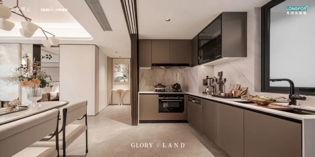 厨房配置西门子的油烟机 灶具 洗碗机、摩恩垃圾处理器、凉霸等,提升烹饪体验。且厨房连通北向设备平台,增加储物空间的同时,通风性更好。