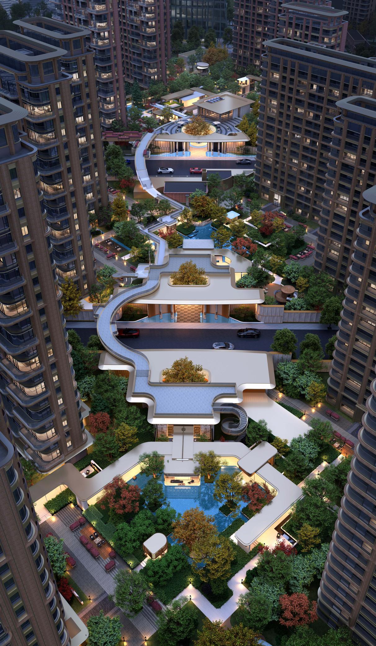 在空间规划上,通过全域约50%的架空设计、跨地块连廊与两条滨河连桥,打破了地块与运河的物理边界,让“推窗见河、下楼融河”成为日常,实现从“临水”到“融水”的境界跃升。园林打造上,拒绝平面绿化的浅层表达,构建“地下-地面-空中”三维立体森屿,让建筑仿佛“漂浮于森林之上”,形成会呼吸的生态社区。