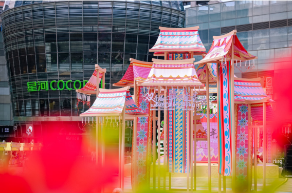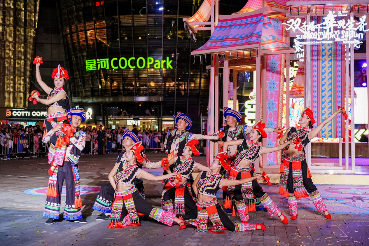 星河WORLD·COCO Park「双子塔下,彝路生花」七周年庆暨民俗文化艺术季首秀,与普宁英歌舞超级联赛震撼齐发。由云南彝绣非遗传承人金瑞瑞等非遗艺术人创作的巨型"彝路生花"装置落地星空广场,木质结构与太阳纹、火纹等图腾交织,传递彝族山峦意象。12月19日至21日期间,彝族朵洛荷舞蹈、海菜腔演唱、憾天虎鼓等十余种非遗表演轮番登场,流星冷焰火映照下,彝服大秀与火把舞将民族美学融入都市夜景。