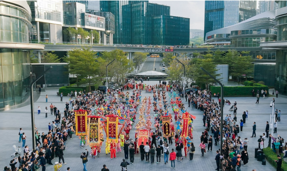 当舞者登顶星河·双子塔369米高空,槌声与云天共鸣,丁达尔光天际乍现,形成"空中史诗"般的视觉奇观。六大英歌舞团巡游队伍穿梭于星河WORLD园区,声势浩大的表演引发路人驻足拍摄,相关短视频在社交平台迅速传播。这场融合高空特技与街头艺术的非遗展演,成为深圳近年来难得一见的民俗文化盛事。