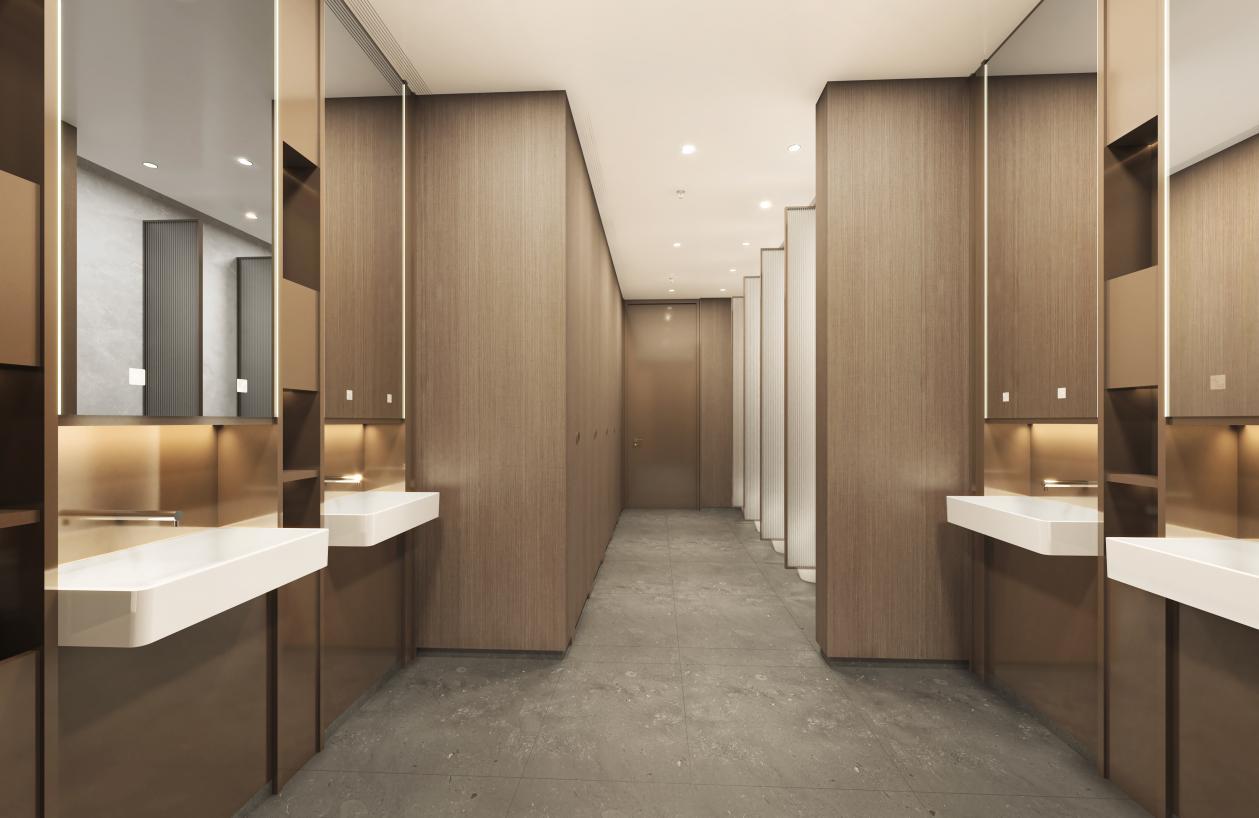 公共区域多选用温润的木质家具,并点缀以自然花饰,柔化建筑结构的“冷硬”感,与项目的绿色健康主题相呼应。卫生间则遵循 “英国绅士俱乐部” 理念,采用独立式洗手台与深色木纹墙面,营造出私密、尊贵的氛围。