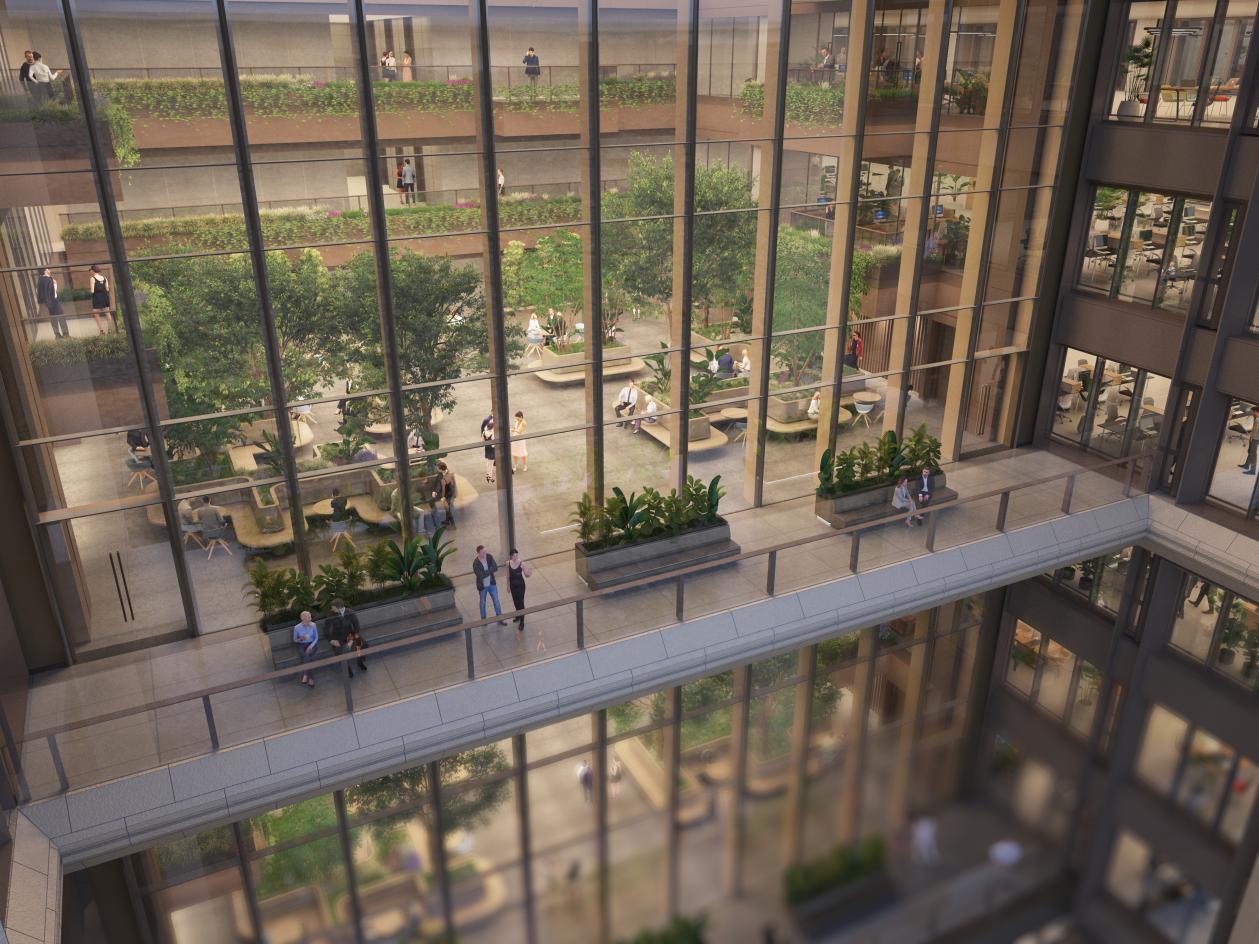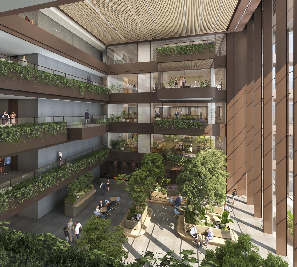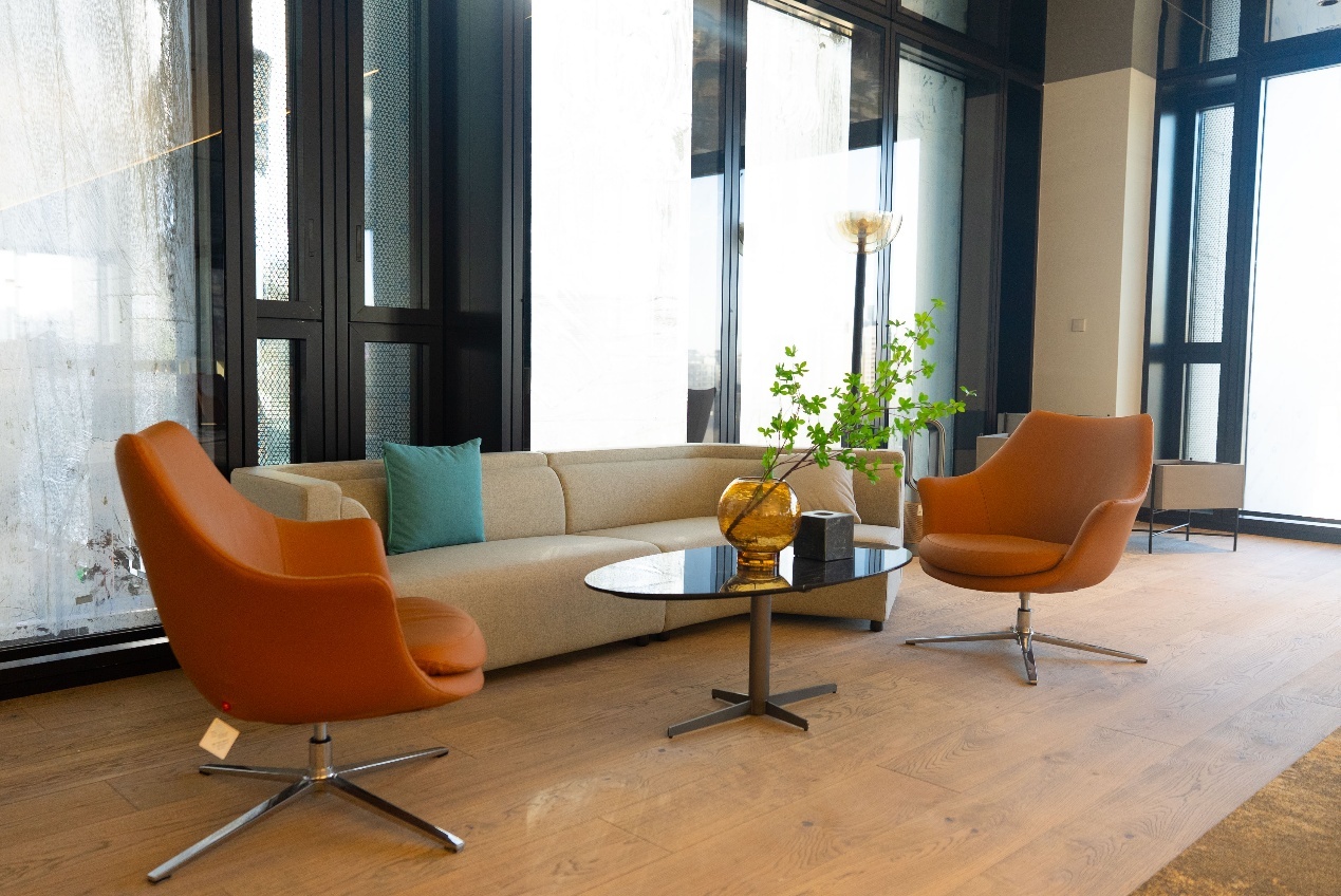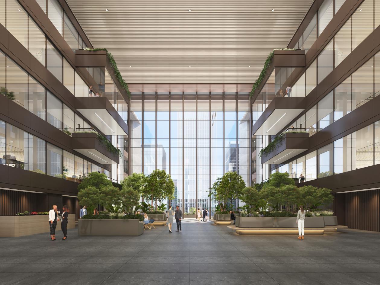 更为独特的是,每个中庭的东侧均连接着室外露台,与室内绿意共同构成一个个内外交融的天然氧吧。客户无需走出大楼,便能享受户外交谈与自然融合的社交体验。