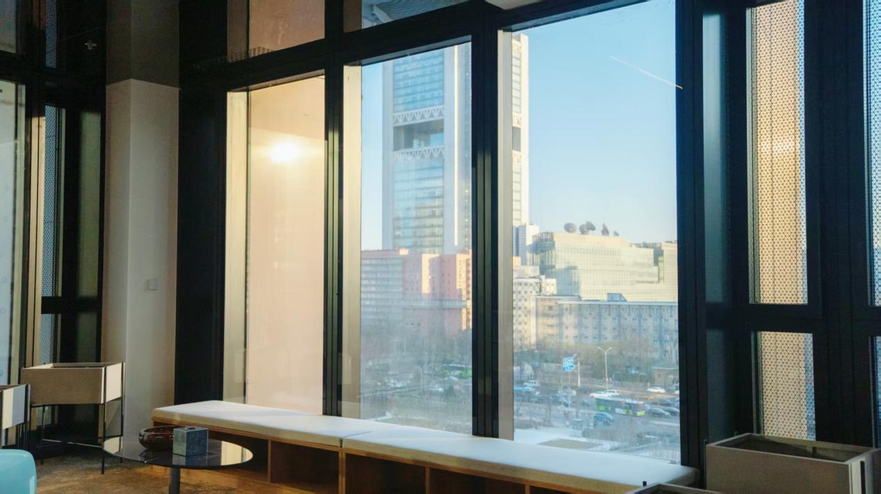 浅色的天然花岗岩石材饰面,远观简洁大气,近看细腻有质感,旨在与北京的城市气质对话;古铜色镀钛金属框架精准勾勒精致层次,与石材的温润形成对比;最内侧通透的玻璃幕墙,则将光线最大限度引入室内。
