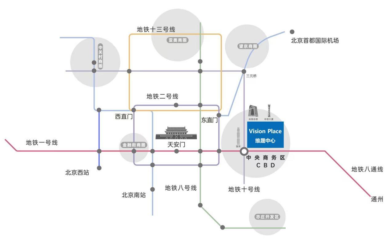 地处CBD核心区腹地,维晟中心自带一种“绝版”的稀缺——国贸桥“金十字” 枢纽,与国贸建筑群、中央电视台总部大楼等地标并肩,南临长安街,西望东三环,东瞰 CBD中央公园,坐拥180度无遮挡首排观景,下楼即可步入公园。未来项目B1层可直通地铁1号线与10号线国贸站。