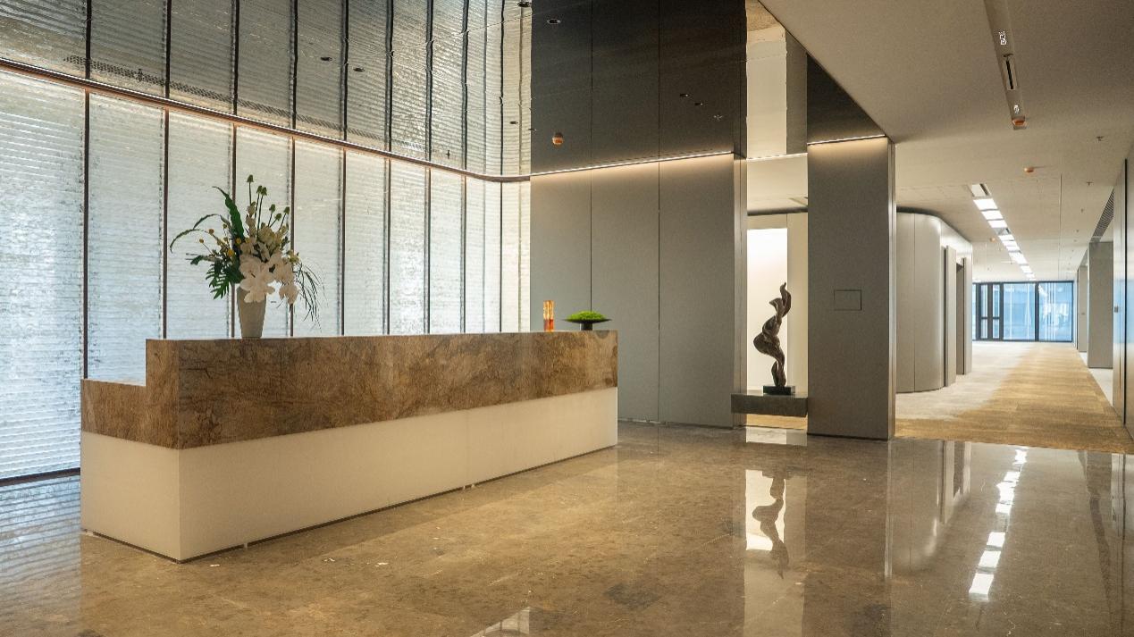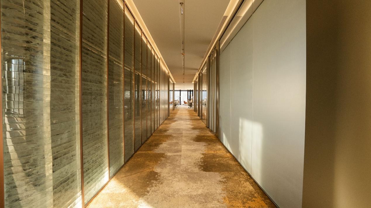 匠心品质,也延伸至维晟中心触手可及的每一处。首层大堂以10米挑高,构筑出一座 “光之殿堂”。墙面由上万块定制琉璃玻璃砖立体叠砌,在两侧灯光映照下,呈现出空灵而梦幻的光影效果。天花采用简洁的磨砂镜面与格栅设计,巧妙隐藏末端设备,将视觉焦点留给璀璨的墙面。