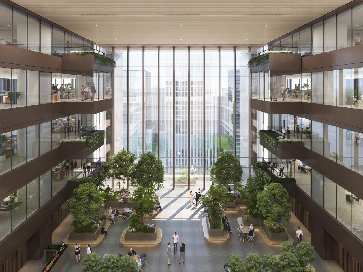 与一般写字楼仅有1-2个中庭不同,维晟中心的共享中庭多达6个,每3至5层即嵌入一座约20米的 “垂直绿洲”,成为CBD区域内共享中庭数量最多的楼宇。
