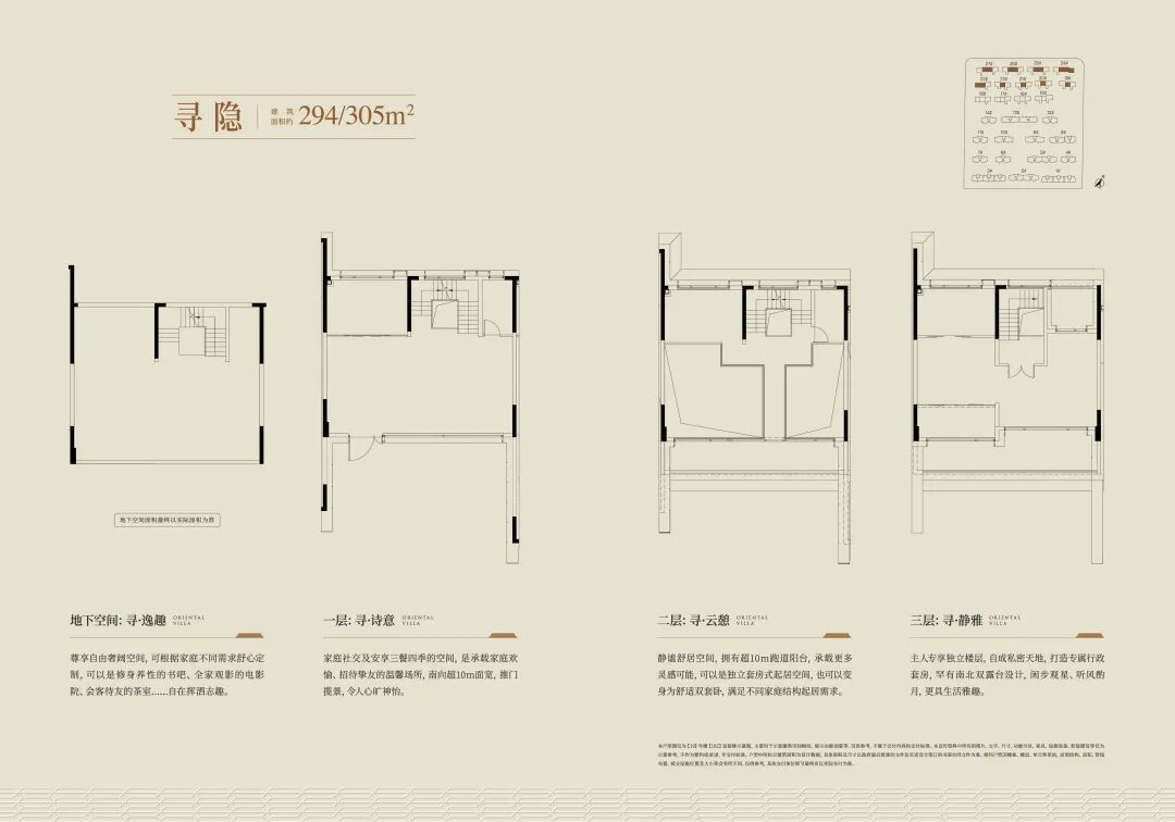 地面一层:家庭社交及安享三餐四季的空间,是承载家庭欢愉、招待挚友的温馨场所,南向超10m面宽,推门揽景,令人心旷神怡;