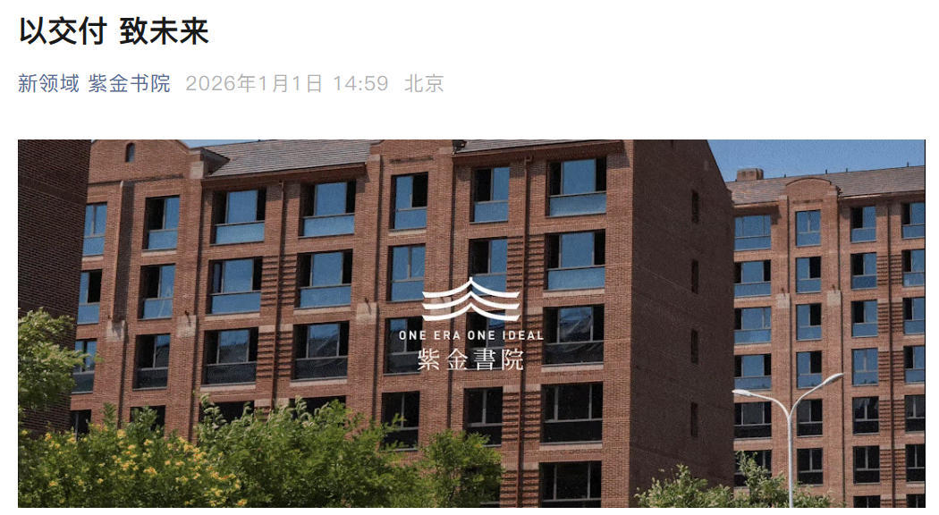位于昌平区回龙观板块的紫金书院,便是在2025年年末众多交房楼盘中的一个。紫金书院的官方账号发布了一篇名为《以交付 致未来》的推文,其中提到:“临近2026年元旦,紫金书院迎来了它的首批家人。”