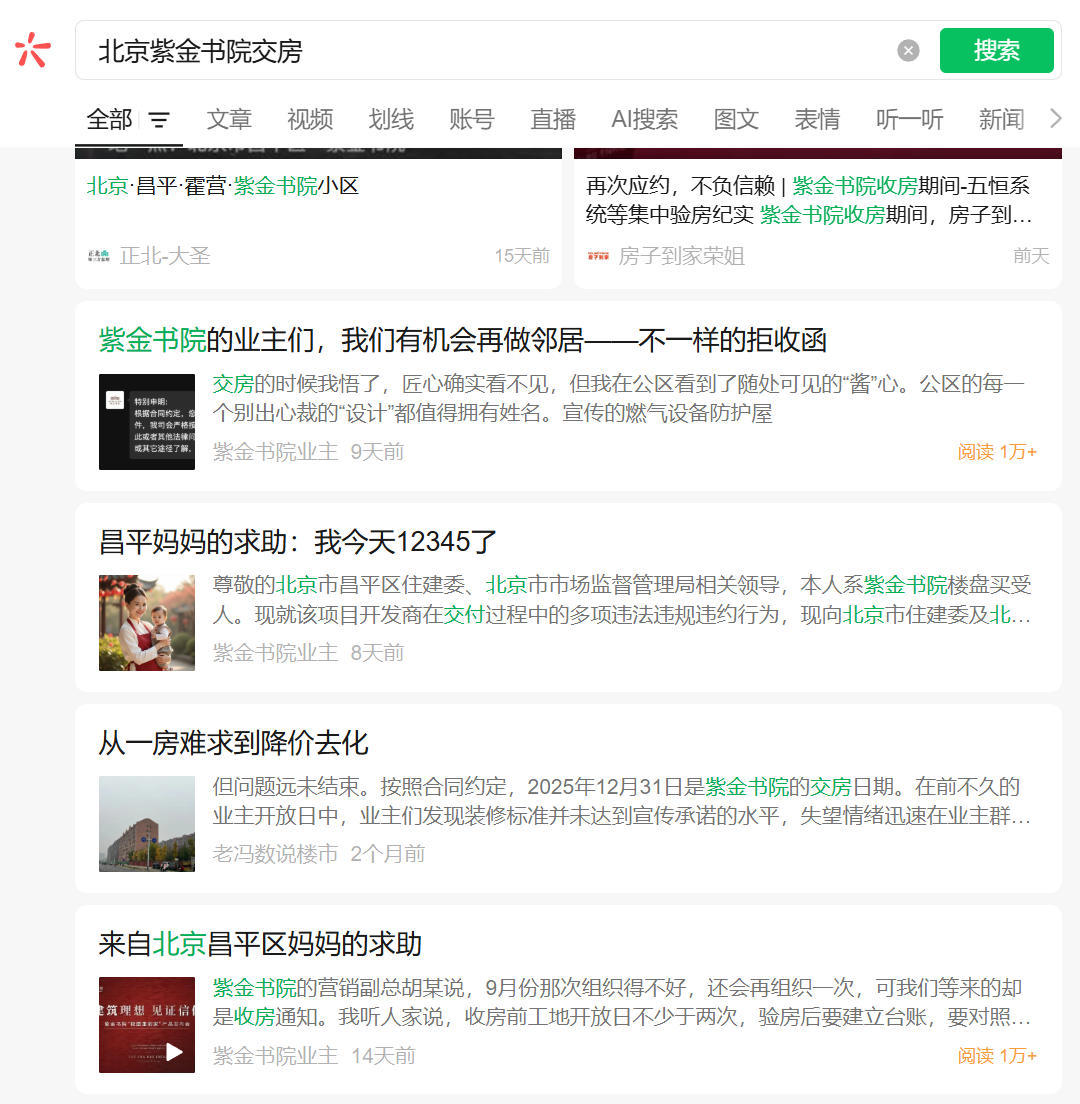 通过搜索“紫金书院交房”这一关键词,我们发现,搜索结果中有大量关于紫金书院业主求助的文章,这些文章大部分来源于名为“紫金书院业主”的公众号。