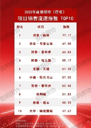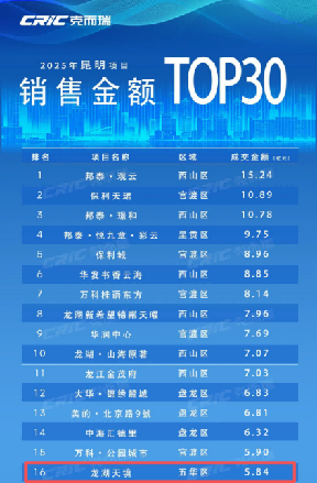 龙湖天境25年8月开盘仅四月余,项目即创下约5.84亿元的热销佳绩,成为昆明市场同期开盘项目中表现最为耀眼的楼盘之一,强势跻身2025年度昆明商品房销售金额榜前列。(数据来源:克而瑞)