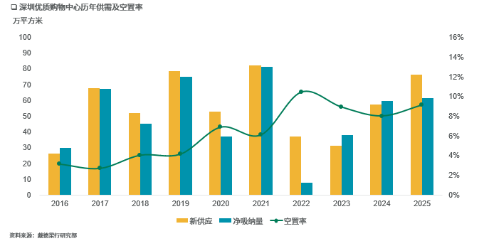供应端亮点涌现的同时,2025年深圳优质购物中心净吸纳量达到近年来较高水平的61.3万平方米,较上年增加3.0%。但消费需求增速仍未及供应规模的快速扩张,全市优质购物中心空置率小幅上行至9.1%。在激烈的市场竞争压力下,深圳优质购物中心平均租金同比下降10.7%至每月每平方米697.1元。